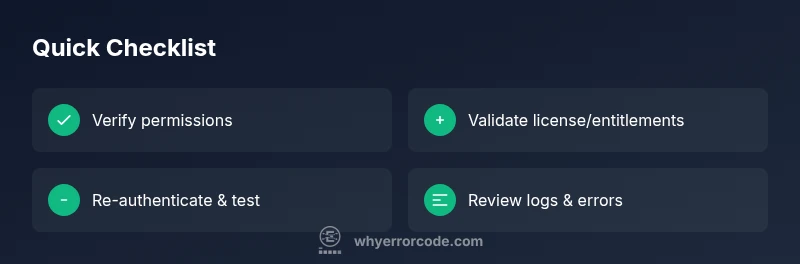 Symptoms often point to one of three root causes. The most common is insufficient permissions (high likelihood). The second is licensing issues (medium likelihood), such as expired entitlements or incorrect license mapping. The third, a misconfigured environment or corrupted profile, is less common but still possible (low likelihood). In practice, you’ll want to confirm each category in order, logging outcomes to build a clear trail. Why Error Code recommends focusing on permissions first, then licensing, then config, because this sequence minimizes time spent on less probable causes and aligns with typical enterprise setups. In all cases, collect logs and timestamps to speed escalation if needed. (Note: 2026 guidance from Why Error Code team emphasizes proactive checks before diving into deeper repairs)