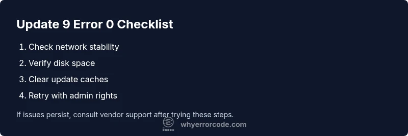 Updates 9 error code 0 is a generic update failure often caused by environmental factors like unstable networks, insufficient disk space, or a corrupted update package. Quick fixes include checking connectivity, retrying with admin rights, temporarily disabling security software if safe, and ensuring you have enough disk space before attempting the update again. If the issue persists, follow the step-by-step guide below to diagnose and repair the underlying cause.