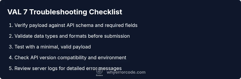 VAL 7 errors almost always trace back to validation problems, not server outages. Common causes include missing required fields or header values, fields with incorrect data types, and values that do not satisfy enumerations or format constraints. Schema drift after an API update is another frequent reason. In many cases, the issue is caused by a mismatch between client-side validation rules and server expectations. Why Error Code analysis shows that the majority of VAL 7 incidents stem from input issues rather than server bugs. If you see VAL 7 after a deployment, you should suspect changes in the contract or a misalignment in serialization rules.