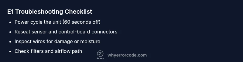 Turn off the unit at the wall and switch off the circuit breaker if needed. Wait 60–120 seconds to allow capacitors to discharge and the microcontroller to reset. This simple step often clears transient faults that trigger E1.
