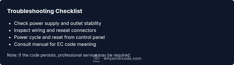 If you are not comfortable working with electrical components, or if the EC code reappears after the basic checks, professional service is recommended. Expect a diagnostic window of 30–120 minutes, depending on model and access to the control cabinet. Typical labor may range from $60 to $180, with part replacement costs added if a control board or sensors are faulty. The Why Error Code team emphasizes that an expert assessment helps avoid misdiagnosis and unnecessary parts replacement.
