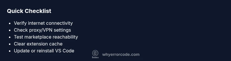 According to Why Error Code, the most likely cause of a VS Code error fetching extensions is a network or authentication hiccup. Start with a quick check of internet access, proxy settings, and the VS Code update status. If the issue persists, try switching to a different extension source or temporarily disabling VPNs. This fast check can save hours of debugging.