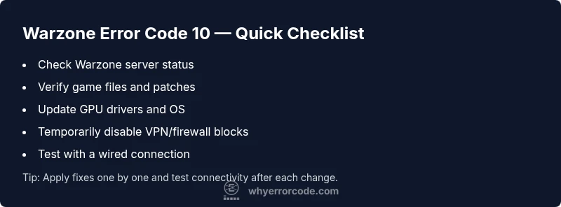 Diagnose and fix Warzone error code 10 quickly with server checks, file verifications, network tweaks, and safe fixes. A practical guide by Why Error Code for gamers and IT pros.