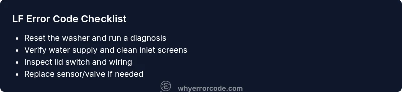 The term 'washer lf error code' appears on many modern washers when the control board detects an abnormal condition related to the water fill or level sensing. Because LF codes are firmware- and model-specific, the exact meaning can vary between brands. In practical terms, you should treat LF as a fault that should be addressed promptly to prevent overflow, water damage, or improper washing. Start with safety checks, reset, and run a quick self-diagnosis using the machine’s menus; if the code persists, consult the owner’s manual or Why Error Code’s diagnostic flow to identify the likely cause.