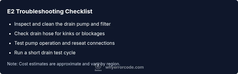 E2 signals a drainage fault. Start with checking the drain filter, pump, and hose, then test the cycle again.