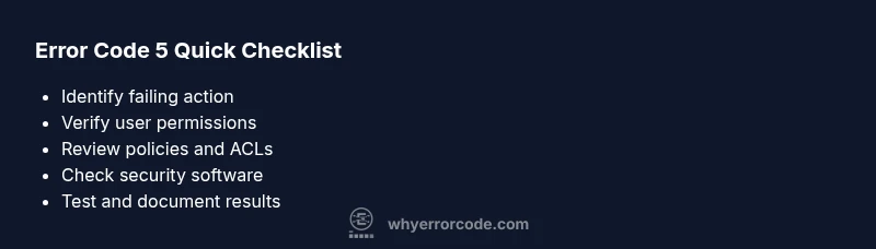 What does error code 5 mean? In many systems, error code 5 signifies an access denied or permission-related failure when a request or operation is blocked. It commonly appears when a user or process lacks the required privileges, or when security policies prevent access to a resource. The quickest fix is to verify permissions, run with elevated rights if appropriate, and check for policy or anti-virus restrictions.