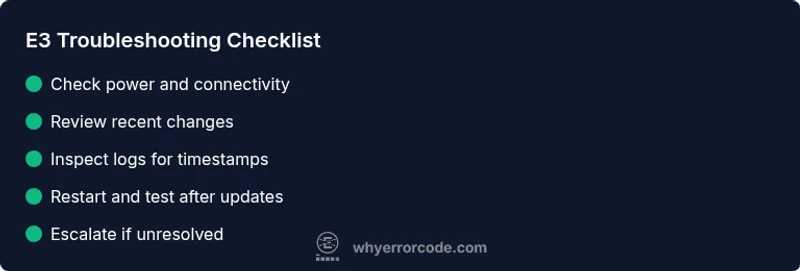 If you’re facing error code as 3 right now, there are fast, non-destructive actions you can try. Start with a safe restart or power cycle to clear transient states. Then, review recent changes—new software, configuration edits, or connected devices—and revert if possible. Check for any related warnings or logs that accompany E3, especially timestamps. These quick checks often reveal the most probable cause and help you decide whether you can fix it yourself or need professional help. Remember, these are quick fixes designed to buy time while you gather details for deeper troubleshooting.