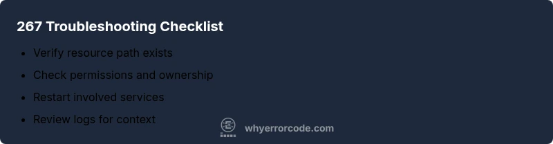 Error code 267 is context-specific, meaning its meaning varies by software or device, but it often points to a path or resource issue. In most cases, verify that the referenced directory or file exists, check permissions, then restart the involved service or application and retry the operation. If the problem persists, capture relevant log entries and note the exact sequence leading to the code.