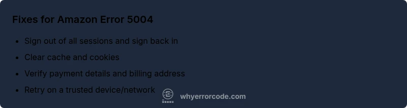 Error 5004 is a temporary block or verification prompt. It usually means Amazon needs you to confirm identity, update payment details, or check regional eligibility before you can complete an action.