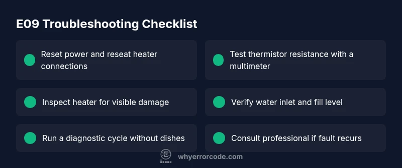 When you see the error code E09 on a Bosch dishwasher, it generally signals a problem with the appliance's ability to heat the wash water to the proper temperature. Temperature is critical for effective cleaning and sanitation, so the control board will halt the cycle and display the fault to prevent dishware from being washed in underheated water. The exact root cause can vary by model and age, but heating-related faults are among the most common. According to Why Error Code, the heating circuit, temperature sensor (thermistor), and related wiring are the most likely culprits. Start your investigation with a clear plan: verify power and water supply, inspect heater connections, and test the sensor readings before replacing parts. Document any patterns like recurrences after a cooling-down period to help determine if the fault is intermittent or persistent.