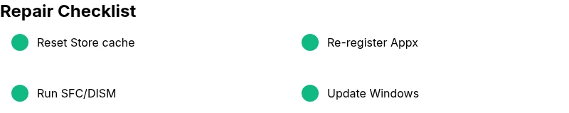 Close all Store-related apps, then run wsreset or use Settings to clear cache. This removes stale package data that can block new installs.
