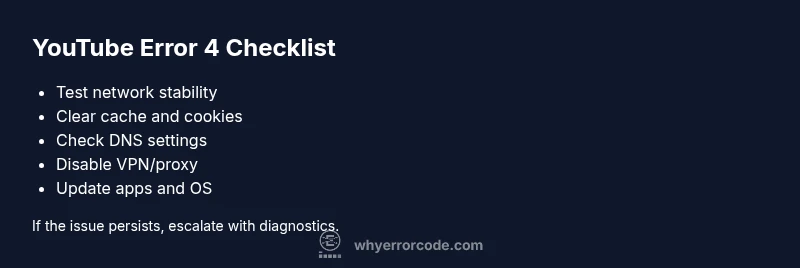 Error code 4 on YouTube is a broad, user-facing signal that the player cannot successfully load or stream video content. From a technical standpoint, it usually points to a breakdown in the data pathway between your device and YouTube's servers. This can be caused by a weak internet connection, DNS resolution problems, or a stale cache that prevents fresh streaming data from arriving. In practical terms, users encounter this when videos fail to start, stall during playback, or present an intermittent buffering state. According to Why Error Code, understanding this code hinges on isolating network, device, and application factors, then applying layered fixes rather than jumping straight to hardware changes. This approach keeps you focused on the most impactful remedies and avoids unnecessary steps.