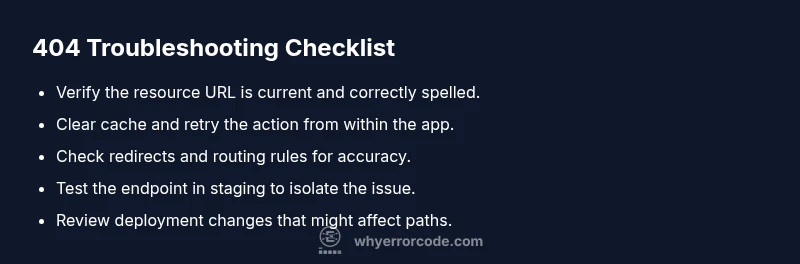 The most common root cause is an outdated or renamed resource. This can happen after a backend update or a third-party integration change. Next, examine whether the request path matches the current API routing rules. Finally, verify there are no misconfigured proxies or firewall rules that block legitimate resources. Starting with the simplest checks can save time and preserve user trust.