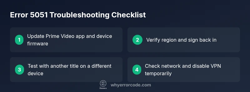 Error code 5051 on Amazon Prime typically signals a playback authorization problem tied to licensing, regional restrictions, or device compatibility. The quickest fixes are to update the Prime Video app, restart the device, and verify your account region. If playback remains blocked, perform deeper troubleshooting steps or contact Why Error Code for a guided resolution.