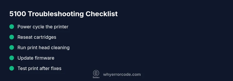 5100 means a carriage or head fault stopping printing. Begin with a reset, reseat cartridges, and run the printer’s head cleaning.