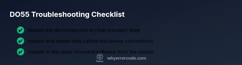 DO55 is a general fault indicating a communication or data integrity issue between components. It typically signals a timeout or protocol mismatch. The fastest path to resolution is a controlled restart, verified connections, and applying the latest firmware or software update. If the error persists, consult vendor docs or support with logs and steps to reproduce.
