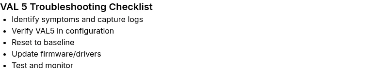 - Reboot and validate the affected workflows to confirm VAL 5 disappears.