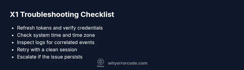 Users typically see a red or warning banner with X1, or a failed operation message in the logs. Common visual cues include authentication prompts reappearing, tokens failing validation, and API calls timing out. The impact can range from minor feature unavailability to full service disruption for automated tasks. Because X1 revolves around identity and access, any delay in remediation can cascade into data freshness issues and stale sessions across the environment.