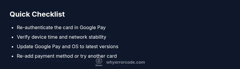 - Re-enter your payment details and reauthenticate when prompted. - Ensure the Google Pay app is up to date. - Check that the device clock and time zone are correct. - Switch to a stable Wi-Fi network or enable mobile data with a strong signal. - If the issue persists, try a different payment method or card.