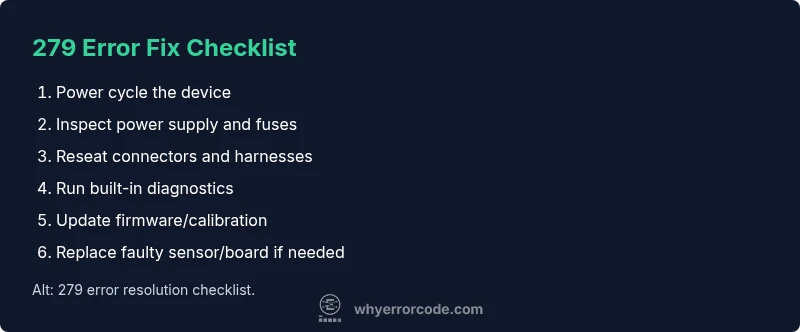 Error code 279 is a generic fault signal that varies by manufacturer, so you should start with a cautious, methodical diagnosis. It often points to a sensor input, a communication link, or a safety interlock that blocks operation. The quickest fix is a power-cycle, connected-component check, and consulting the vendor manual if the problem persists.