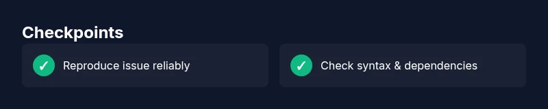 - mediumVerify environment, versions, and dependencies; reset to known-good state