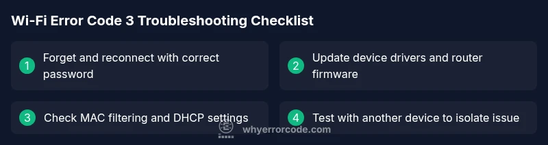 wifi error code 3 usually means a negotiation or authentication failure between your device and the router. It commonly shows when credentials are rejected or the device cannot complete the security handshake. The fastest way to confirm and fix it is to rejoin the network with the correct password, update drivers, and reset the router if needed. If problems persist, proceed with deeper diagnostics.