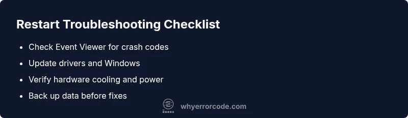 Begin with the simplest checks to avoid unnecessary work. Confirm the device is running on a clean power source and that the outlet and power strip aren’t failing. Check for recent updates and driver installations, and review the reliability history in the Reliability Monitor to identify patterns. If the system restarts in Safe Mode, it points to software or drivers rather than hardware. Collect the exact error code or stop code, timestamp, and any accompanying messages to guide further actions. If you can't reproduce the restart consistently, enable crash dumps and ensure the PC is configured to save a minidump file for analysis. According to Why Error Code, the quickest wins are patching drivers, undoing recent updates, and removing conflicting software.