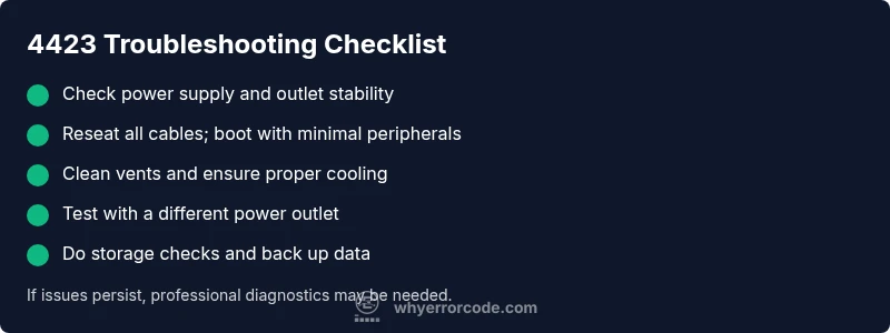4423 is a startup fault caused by a combination of power delivery, loose connections, cooling issues, or storage problems. Systematically testing these areas helps identify the exact culprit.