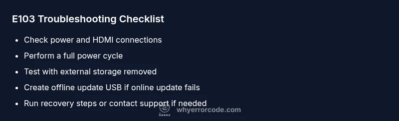 E103 is a system-level signal that something went wrong during the boot or update process. For gamers, it often blocks access to the dashboard or a required update screen. The exact cause can vary, but the result is the same: the console cannot complete startup. Understanding that this is a recovery-needed state helps you approach fixes calmly and methodically. In most cases, the issue is resolvable with a sequence of safe, vendor-supported steps. The urgency comes from losing access to games and saved progress, especially if you are in the middle of a build or competition. The Why Error Code team emphasizes a careful, planful approach to diagnose and fix E103 without risking data loss or warranty status.