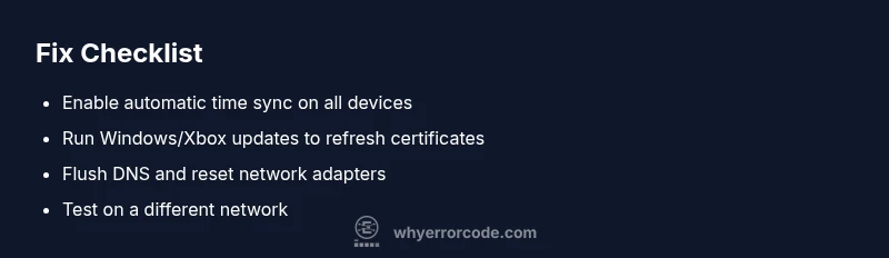- Run Windows Update (PC) or Xbox system updates (console) to refresh certificates and trust stores.