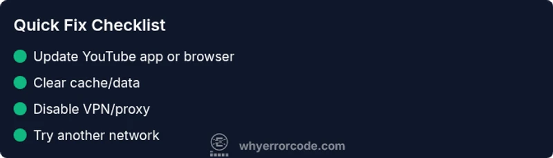 - Check your internet connection and test speed. Ensure you are not on a congested network. 2) Update the YouTube app or browser to the latest version. 3) Clear the YouTube app cache (and data on mobile) or clear browser cache and cookies. 4) Disable VPNs or proxies and try again. 5) Reopen YouTube and sign in again to refresh tokens. 6) If using a smart TV or console, reboot the device and reattempt. 7) If the error persists, reinstall the YouTube app. After each step, re-check playback. Estimated time: 20-60 minutes.
