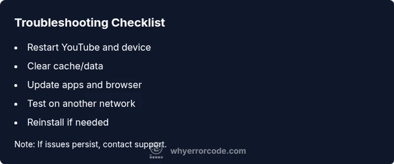 If standard fixes fail across devices and networks, contact YouTube Support or check the Help Center for guidance and status updates.