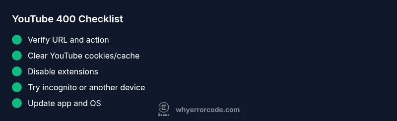 youtube error code 400 means a bad request from YouTube, typically caused by malformed URLs, corrupted cookies, or blocked request parameters. The quickest fix is to refresh the page, clear cookies for YouTube, and disable conflicting extensions. If the problem persists, try a different browser or reset the YouTube app data.